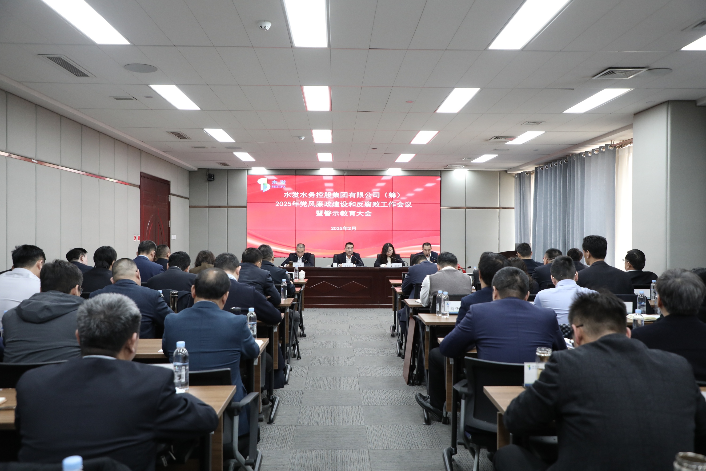 水發(fā)水控集團(tuán)領(lǐng)導(dǎo)班子成員、各部室負(fù)責(zé)人、各區(qū)域公司總經(jīng)理、各權(quán)屬公司黨支部書記,總部及各區(qū)域公司黨員代表、水控集團(tuán)總部紀(jì)委全體人員等60余人參加會(huì)議。